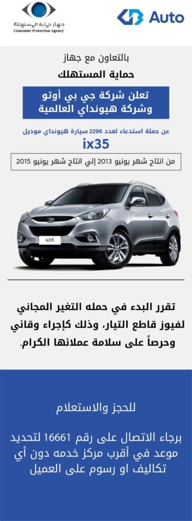 أعلنت شركة جي بي غبور أوتو وشركة هيونداي العالمية، عن حملة استدعاء عدد من سيارات هيونداي طراز ix 35.