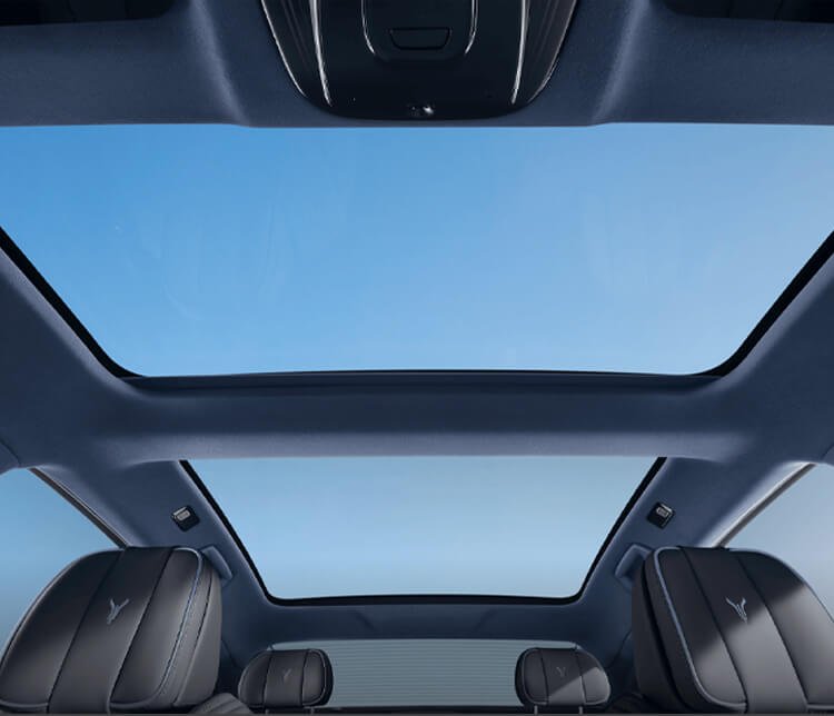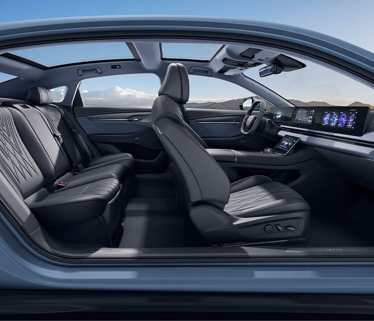 تقدم VOYAH Passion تجربة قيادة مميزة حيث زودت مقصورتها بـ ثلاث شاشات رقمية عالية الوضوح قياس 12.3 بوصة لكل منها، إلى جانب شاشة عرض على الزجاج الأمامي AQ Head Up Display، كما تضم السيارة سقفًا بانوراميًا واسعًا.
