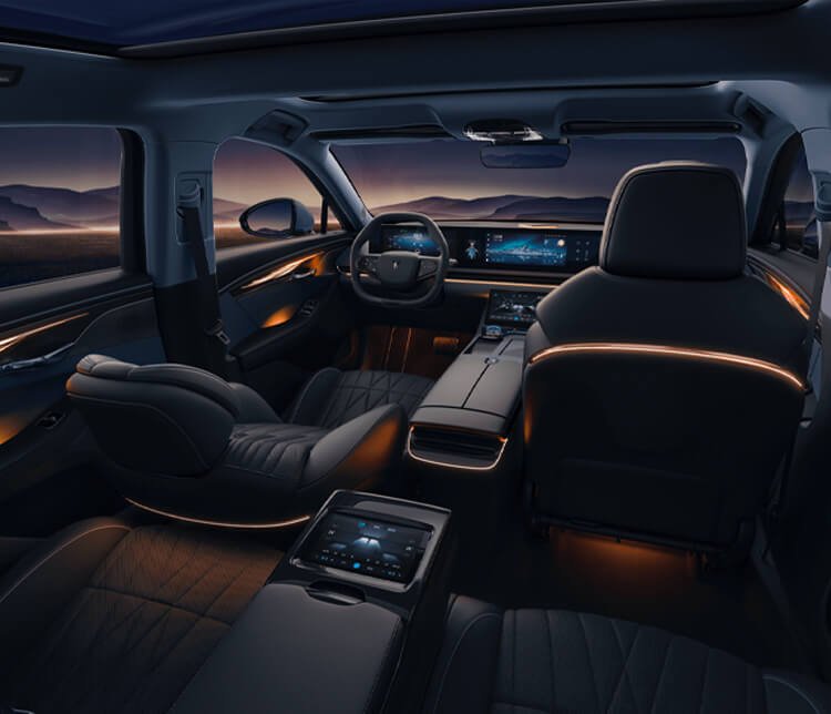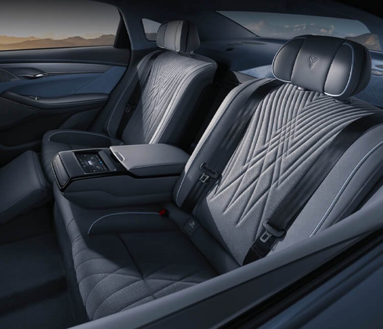 وتتضمن مقصورة الركاب الخلفية شاشة مركزية مدمجة في مسند الذراع لركاب الـ VIP في الصف الثاني، مع مقاعد مزودة بوظائف التدفئة، والتهوية، والتدليك، ودعم الأرجل القابل للتعديل كهربائيًا، لتوفير أقصى درجات الراحة للركاب. كما تدعم السيارة تقنية التعرف على الوجه Face ID، ونظام التحكم بالإيماءات Gesture Control، مع إمكانية التحكم في أربعة مناطق صوتية مستقلة داخل المقصورة.