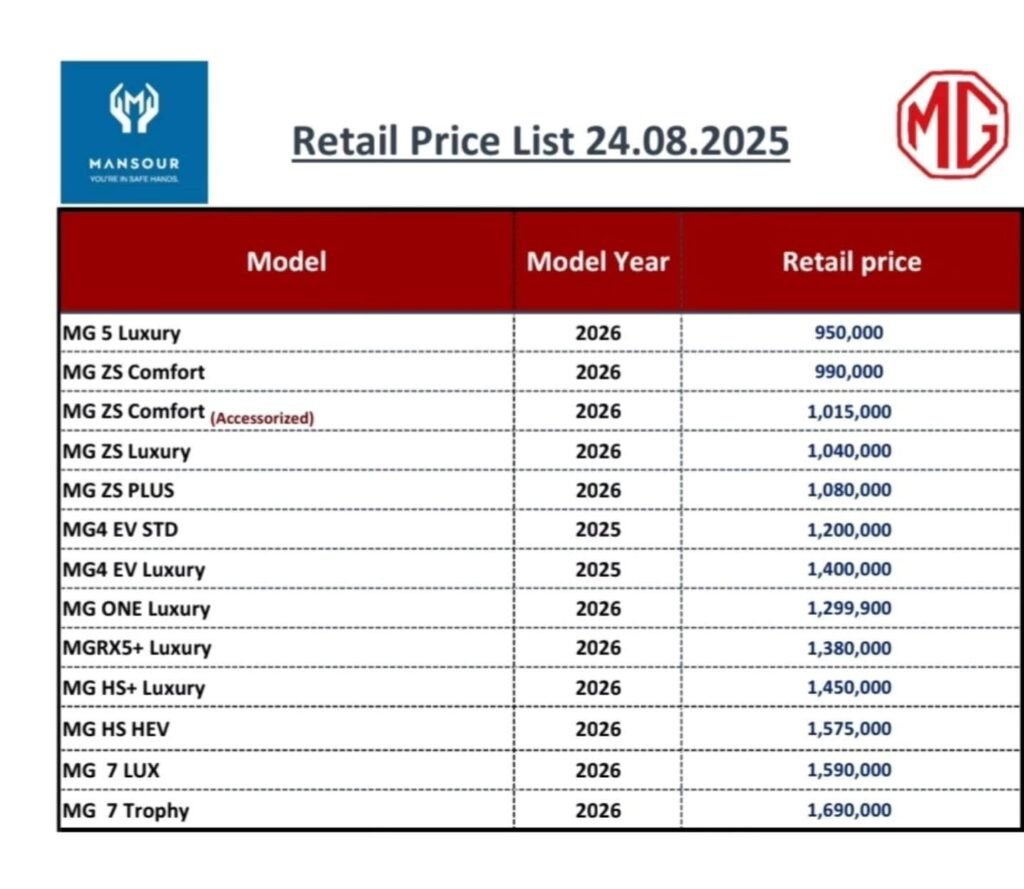 شملت القائمة الرسمية الجديدة أسعار طرازات إم جي المتاحة حالياً في السوق المصري على النحو التالي: