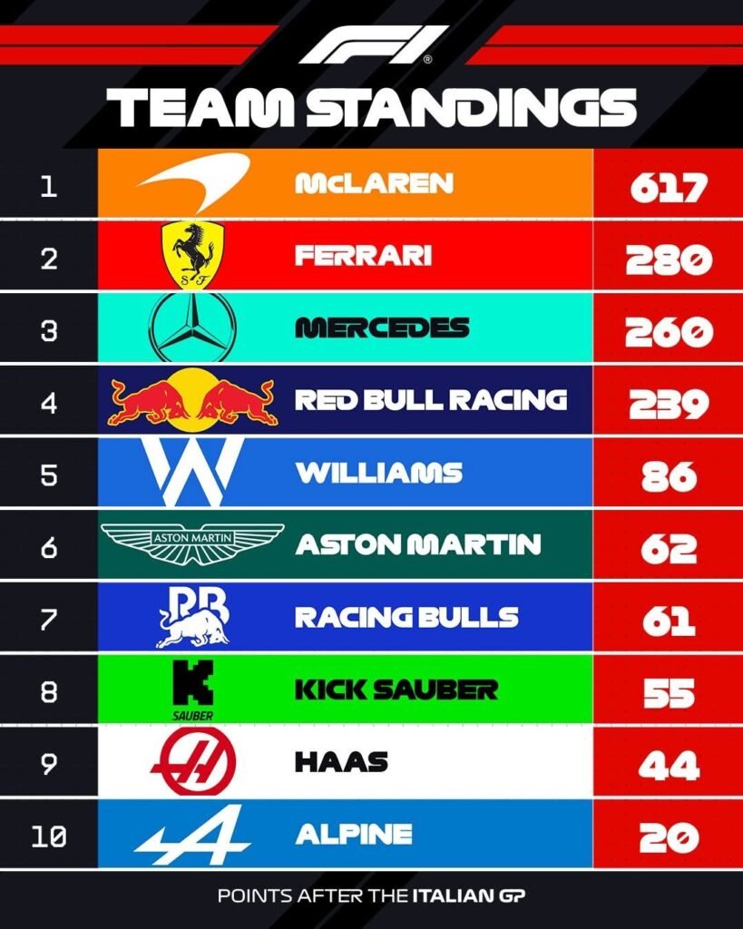 مع نهاية سباق مونزا، تقلص الفارق في صدارة بطولة العالم بين أوسكار بياستري ولاندو نوريس إلى 31 نقطة فقط، بينما أعاد فوز فيرستابن الأمل لفريق ريد بُل في المنافسة على مزيد من الانتصارات خلال الجولات المقبلة. ولا يزال الموسم يضم ثمانية سباقات كبرى وثلاثة سباقات سريعة Sprints.
