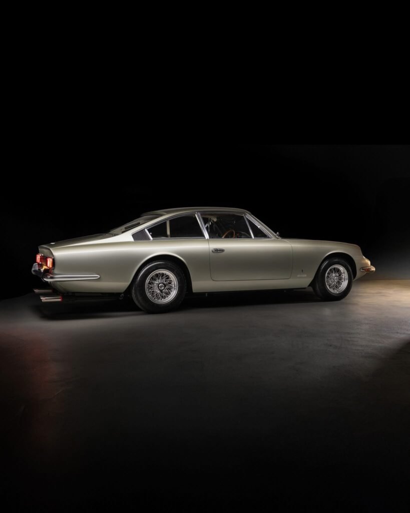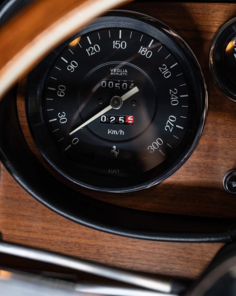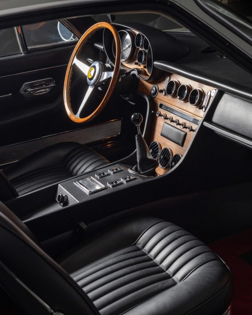 السيارة المعروضة اليوم تحمل رقم الهيكل 11721، وقد اكتمل تصنيعها في نوفمبر من عام 1968، قبل أن يتم تسليمها جديدة إلى سويسرا عبر الوكيل الرسمي للعلامة هناك SAVAF -Société Anonyme pour la Vente des Automobiles Ferrari في جنيف. وجاءت هذه النسخة بلونها الأصلي الذي ما زالت تحافظ عليه حتى اليوم، وهو اللون الخارجي Grigio Argento الفضي الرمادي، مع مقصورة داخلية من جلد Pelle Nera الأسود وفرش أرضية أحمر اللون. وكانت هذه التوليفة اللونية نادرة للغاية، إذ لم يتجاوز عدد السيارات التي سُلّمت إلى السوق السويسرية بهذه المواصفات 22 نسخة فقط، من أصل 94 سيارة وُجهت بالكامل إلى سويسرا.