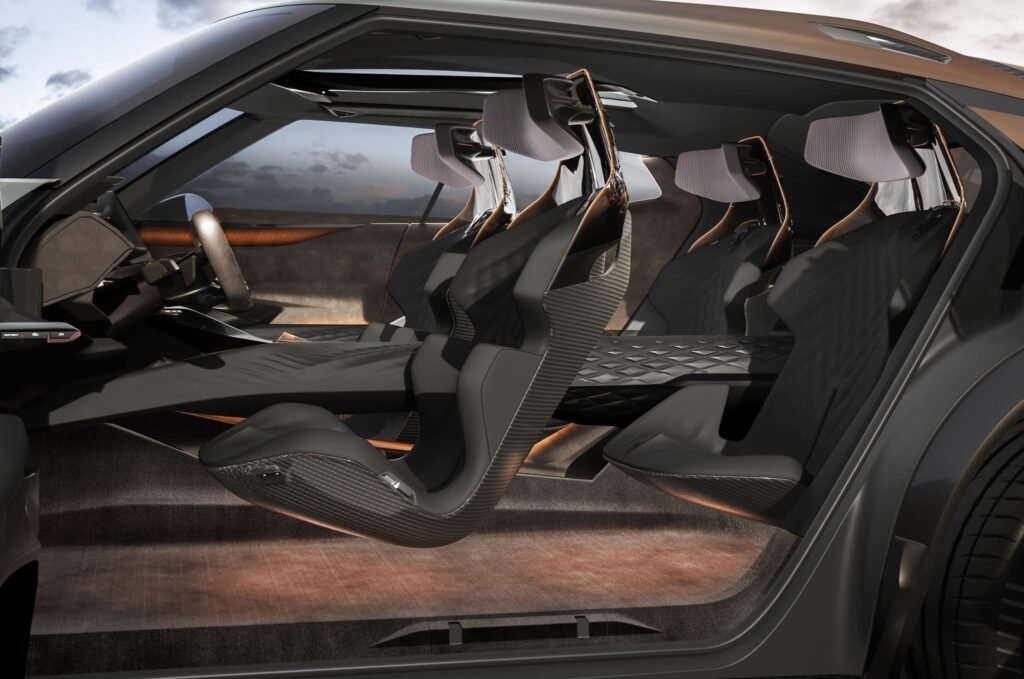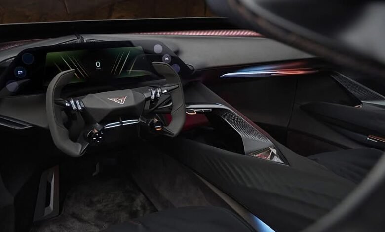 في الداخل، تأتي كوبرا تندايا CUPRA Tindaya بمقاعد وكأنها “معلقة” عن الأرض، مع كونسول وسطي ممتد حتى المقاعد الخلفية.