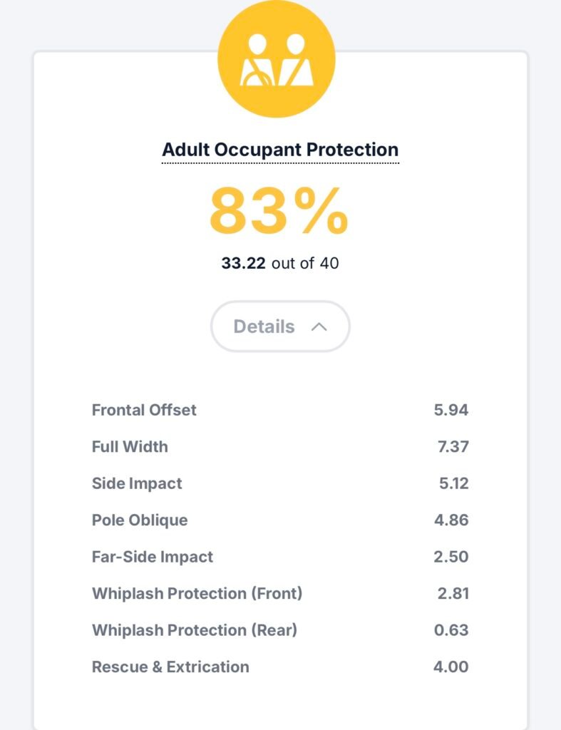 حصلت كيا K4 على نسبة 83% في حماية الركاب البالغين بما يعادل 33.22 نقطة من أصل 40. في اختبار الاصطدام الأمامي الجزئي MPDB عند سرعة 50 كم/س، بقيت مقصورة الركاب مستقرة، حيث أظهرت القياسات أن حماية صدر السائق كانت عند مستوى “ضئيلة”، بينما كانت الحماية لأرجل السائق الأمامية “مقبولة”، وللقدمين “مقبولة” أيضًا رغم تسجيل حركة رجعية لدواسات الفرامل. أما بالنسبة للراكب الأمامي فقد كانت الحماية لأجزاء الجسم الحرجة “جيدة”. أما في اختبار الاصطدام الأمامي الكامل، فجاءت الحماية “جيدة” لمعظم مناطق جسم السائق، بينما كانت حماية صدر الراكب الخلفي “ضئيلة “. في اختبارات الاصطدام الجانبي كانت حماية صدر السائق “ضئيلة “، بينما في اختبار الاصطدام مع العمود الجانبي Oblique Pole كانت الحماية للصدر “ضعيفة”، مع تقييم “جيد” لبقية مناطق الجسم الحرجة.