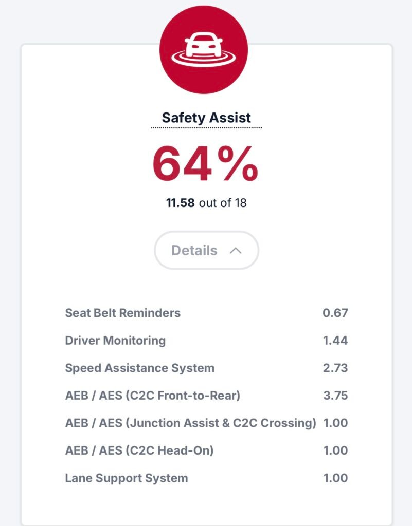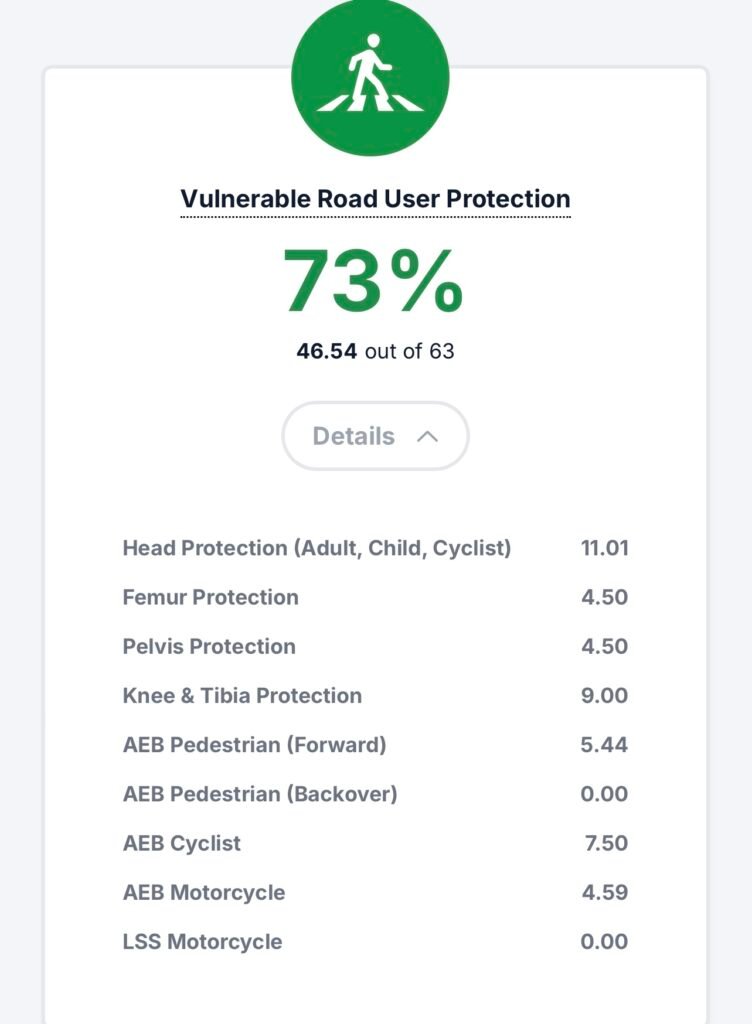 سجلت كيا K4 نسبة 73% بما يعادل 46.54 نقطة من أصل 63. في اختبارات الاصطدام الفعلي للمشاة وراكبي الدراجات، جاءت حماية الرأس “جيدة” أو “مقبولة” في معظم مناطق غطاء المحرك والزجاج الأمامي، مع نتائج “ضئيلة” و”ضعيفة” عند قاعدة الزجاج وأعمدة الهيكل الأمامية. أما الحماية للفخذين والحوض والساقين فقد جاءت “جيدة” وسجلت السيارة أقصى عدد من النقاط. أما نظام الفرملة الطارئة للكشف عن المشاة وراكبي الدراجات، فقد أظهر أداءً “جيدًا” في معظم سيناريوهات الاختبار عند السير للأمام، لكنه لم يتفاعل عند الرجوع للخلف. كذلك قدم النظام أداءً جيدًا مع راكبي الدراجات في أوضاع السير المستقيم أو عند الانعطاف، إضافة إلى وظيفة تحذيرية عند اقتراب دراجة من الخلف لفتح الأبواب. أما في حالة الدراجات النارية، فقد كانت النتائج مختلطة، إذ سجل النظام أداءً مقبولًا عند بعض السيناريوهات، لكنه كان ضعيفًا في حالات الطوارئ المتعلقة بتغيير المسار.