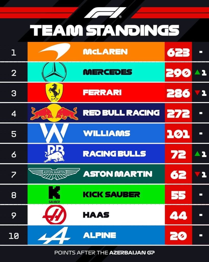 في المقابل، يعاني فريق ماكلارين McLaren من سلسلة من المشكلات منذ عودة البطولة بعد العطلة الصيفية، كان أبرزها انسحاب نوريس في جائزة هولندا الكبرى بسبب تسرب زيت، والجدل حول أوامر الفريق في مونزا، ثم حادث خروج بياستري في اللفة الأولى من سباق أذربيجان. هذه المشكلات قد تمنح فيرستابن فرصة للضغط على ثنائي ماكلارين في الجولات المقبلة.