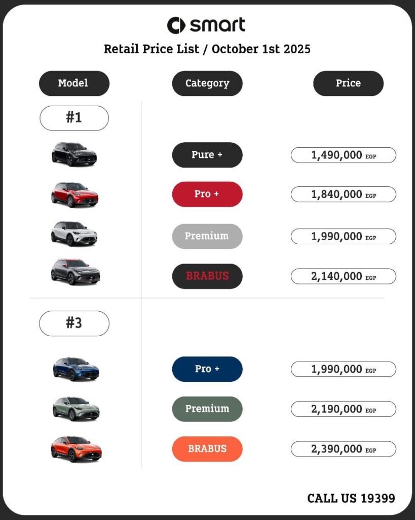 أما سمارت #3 Smart #3 الذي ينتمي إلى فئة الكروس أوفر الكهربائية الرياضية، فقد طُرح بفئة Pro + بسعر مليون و990 ألف جنيه، في حين بلغ سعر الفئة Premium 2 مليون و190 ألف جنيه، أما النسخة الرياضية بباقة Brabus فقد جاءت بسعر 2 مليون و390 ألف جنيه.