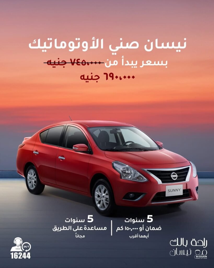 تعتبر نيسان صني Nissan Sunny واحدة من أكثر السيارات مبيعًا في السوق المصري بفضل اعتماديتها وتكلفتها الاقتصادية، وقد شملت التخفيضات جميع فئاتها. حيث انخفض سعر فئة AT-Base من 745 ألف جنيه إلى 690 ألف جنيه بتخفيض قدره 55 ألف جنيه، كما انخفضت فئة AT-Mid من 780 ألف جنيه إلى 745 ألف جنيه بتخفيض 35 ألف جنيه، بينما تراجعت فئة AT-Super Saloon من 810 آلاف جنيه إلى 795 ألف جنيه بتخفيض 15 ألف جنيه.