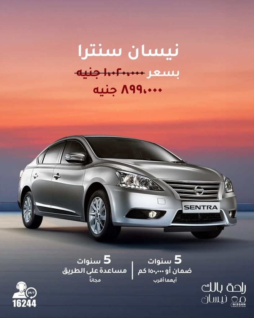 السيارة السيدان المتوسطة الحجم نيسان سنترا Nissan Sentra جاءت بتخفيض كبير في فئة Highline، حيث تراجع سعرها من مليون و20 ألف جنيه إلى 899 ألف جنيه، أي بتخفيض ضخم وصل إلى 121 ألف جنيه، ما يجعلها واحدة من أبرز العروض الحالية من نيسان في مصر.