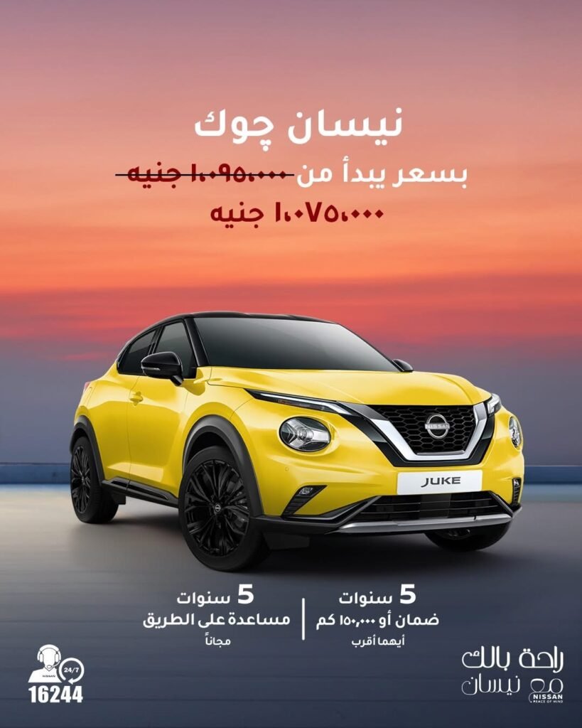 السيارة الكروس أوفر المدمجة نيسان جوك Nissan Juke حصلت على تخفيضات متقاربة في معظم فئاتها، حيث انخفض سعر فئة Accenta من مليون و95 ألف جنيه إلى مليون و75 ألف جنيه بتخفيض 20 ألف جنيه، وفئة Tekna من مليون و195 ألف جنيه إلى مليون و175 ألف جنيه بنفس قيمة التخفيض، وكذلك فئة Tekna N-design من مليون و245 ألف جنيه إلى مليون و225 ألف جنيه.