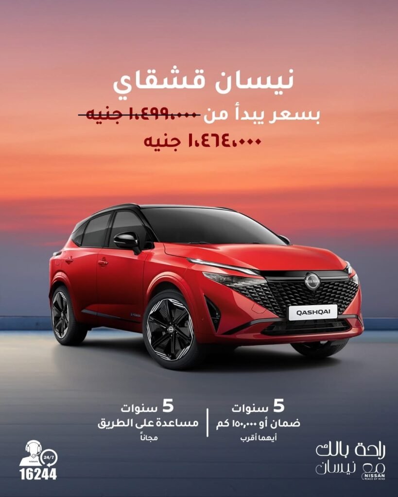 السيارة الـ SUV المدمجة نيسان قشقاي Nissan Qashqai شهدت تخفيضات متساوية في معظم فئاتها بلغت 35 ألف جنيه. فقد انخفض سعر فئة N-Connecta من مليون و499 ألف جنيه إلى مليون و464 ألف جنيه، وفئة N-Connecta + من مليون و675 ألف جنيه إلى مليون و640 ألف جنيه، بينما تراجعت فئة Tekna من مليون و784 ألف جنيه إلى مليون و749 ألف جنيه، وصولًا إلى الفئات الأعلى مثل Tekna+ 4WD التي انخفض سعرها من مليون و964 ألف جنيه إلى مليون و929 ألف جنيه.