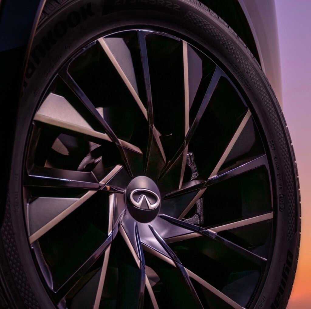 حرصت إنفينيتي على تقديم تجربة بصرية متكاملة من خلال الطلاء ثنائي الألوان الذي يجمع بين الأحمر والذهبي بلمسة Twilight Satin، وهو طلاء يعكس التدرج الضوئي ويمنح هيكل السيارة حضورًا عاليًا. هذا الطلاء يتكامل مع سقف أسود لامع وعجلات رياضية سوداء. كما جاءت التفاصيل البرونزية لتحدد إطار الشبكة وخط السقف المعروف بـ”Spears”، ما يعزز من الطابع الفني.