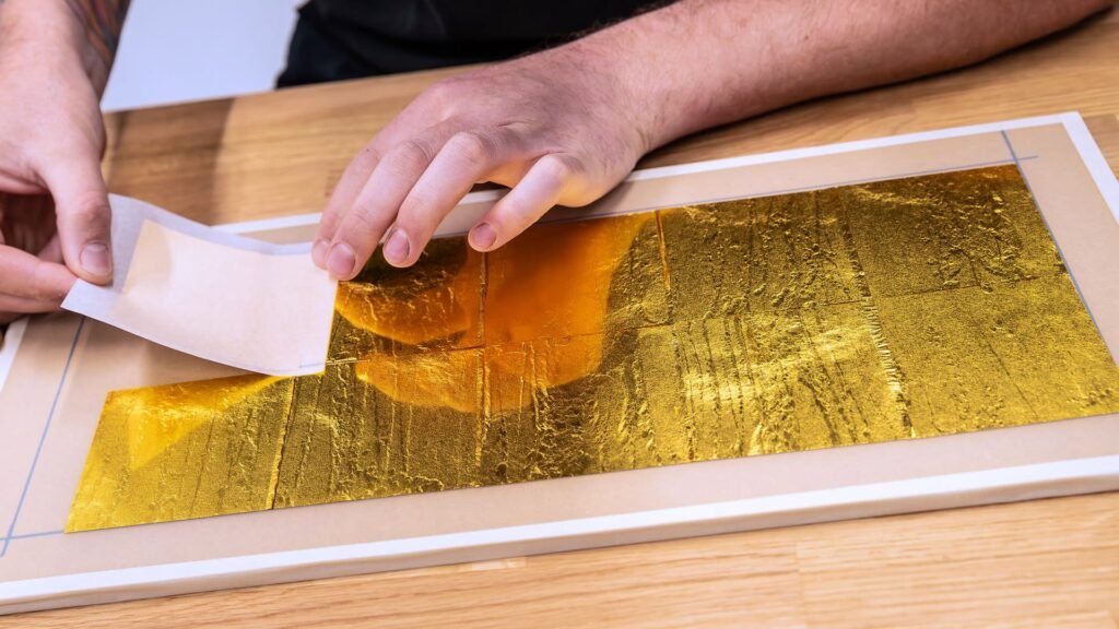 وتم تثبيت مربعات من ورق الذهب بسماكة لا تتجاوز 100 نانومتر يدويًا فوق الألواح الخشبية لتشكّل مسارات ذهبية تحاكي الطرق التي سارت عليها أجيال فانتوم المتعاقبة.