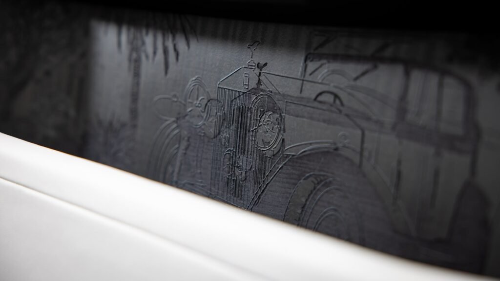 واستخدمت الشركة تقنية النقش بالليزر على ثلاثة مستويات مختلفة من العمق لإنشاء ظلال طبيعية، حيث تظهر النقوش الأعمق بدرجات أغمق لمحاكاة تأثيرات الضوء والظل. وشملت النقوش صورًا متنوعة مستوحاة من تاريخ فانتوم الممتد منذ عام 1925، تضمنت خرائط ومناظر طبيعية وزهورًا وأشجارًا تمثل مراحل مختلفة من تطور السيارة.