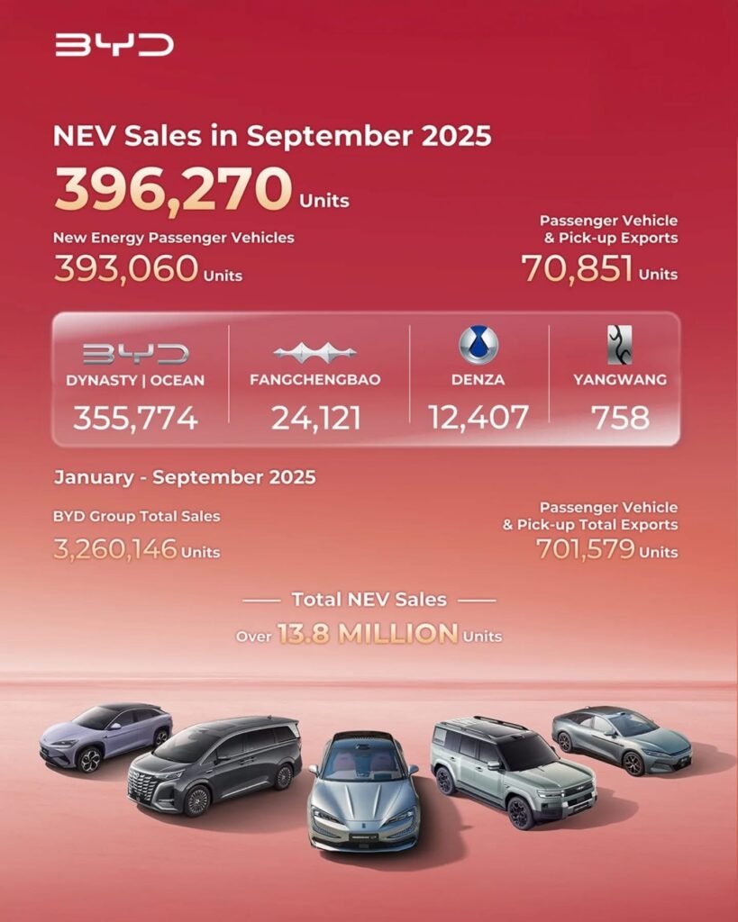 واصلت BYD صدارتها العالمية في سوق السيارات الكهربائية والهجينة القابلة للشحن، حيث أعلنت عن تحقيق مبيعات قياسية خلال شهر سبتمبر 2025 بإجمالي 396 ألف و 270 سيارة من فئة السيارات العاملة بالطاقة الجديدة NEV – New Energy Vehicles.