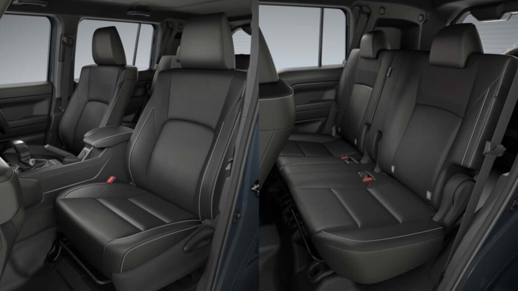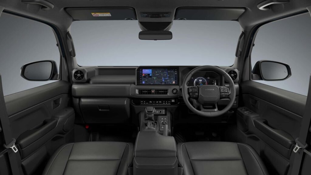 وفي المقصورة، اعتمدت تويوتا تصميمًا عمليًا، حيث يظهر ناقل الحركة الكبير في المنتصف، مع شاشة عرض عريضة بالوضع الأفقي على لوحة قيادة سميكة، ما يمنح السائق رؤية واضحة وتحكمًا مباشرًا في الوظائف الأساسية أثناء القيادة على الطرق الوعرة.