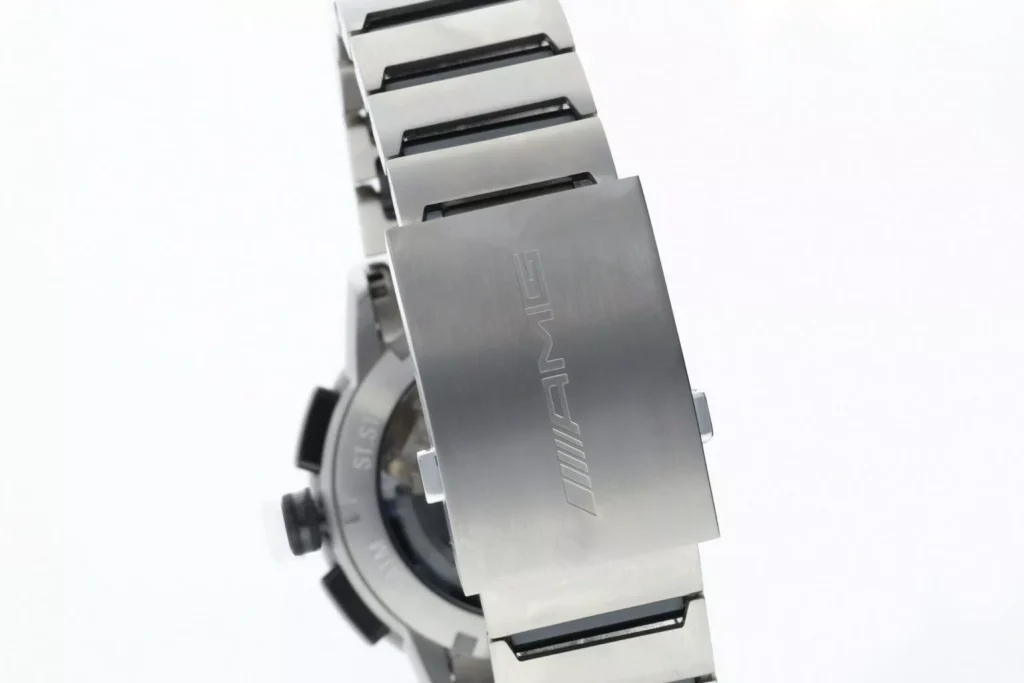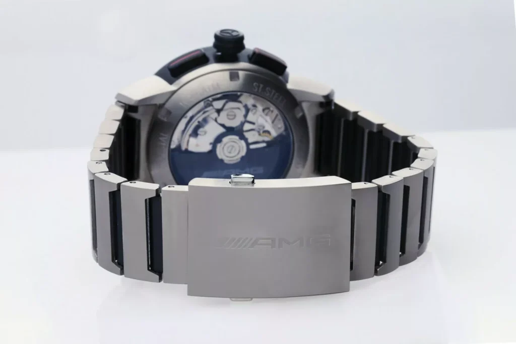 يبلغ قطر الساعة 43.5 مم، وتتمتع بمقاومة للماء تصل إلى 5 أجواء ضغط 5 ATM، بينما يعمل محركها بدقة تصل إلى 48,000 اهتزازة في الساعة، مما يعكس مستوى متقدمًا من الدقة الميكانيكية. ويكتمل التصميم بسوار مصنوع من التيتانيوم، مع وجه محمي بزجاج الياقوت ومزين بتفاصيل باللون الأحمر وشعار AMG الأيقوني الذي يضيف لمسة رياضية مميزة.