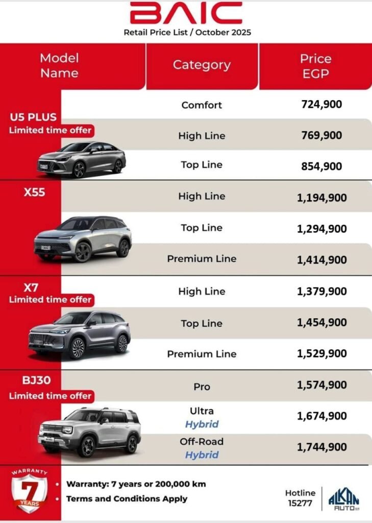 أعلنت ألكان أوتو Alkan Auto، وكيل علامة بايك BAIC، عن قائمة أسعار جديدة لشهر أكتوبر 2025، تضمنت تخفيضات كبيرة على بايك X7 التي شهدت خفضًا في الأسعار بقيمة تصل إلى 195 ألف جنيه مصري لجميع الفئات. كما كشفت الشركة عن طرح فئة جديدة من السيدان U5 Plus تحت اسم Comfort، لتكون الأرخص ضمن فئات الطراز، بسعر 724 ألف و 900 جنيه مصري.
