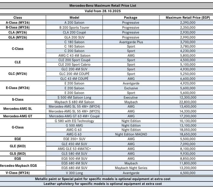 وأكدت مرسيدس-بنز مصر أن الأسعار الواردة تمثل الحد الأقصى للبيع بالتجزئة وتشمل فئات التجهيز الأساسية لكل طراز، مع إمكانية اختيار ألوان خاصة أو جلود فاخرة داخلية بتكلفة إضافية وفقًا لتفضيلات العملاء.