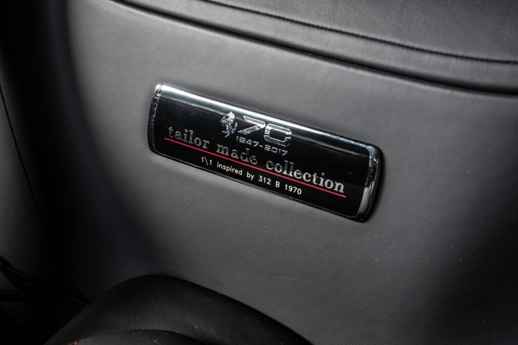 داخل المقصورة، تأتي سيارة فيراري بتصميم داخلي يجمع بين الجلد الفاخر نيرو Nero وتطعيمات حمراء من قماش Kvadrat Gloss Red تغطي الأجزاء الوسطى من المقاعد وألواح الأبواب ومسند الأذرع ولوحة العدادات السفلية ورف الأمتعة الخلفي. دواسات من الألومنيوم بلون ماتيه غريجيو كورسا Matte Grigio Corsa وعناصر من ألياف الكربون غير لامع. وعلى الجدار الخلفي بين المقاعد، تظهر لوحة خاصة تشير إلى كونها إصدار Tailor Made 70th Anniversary.