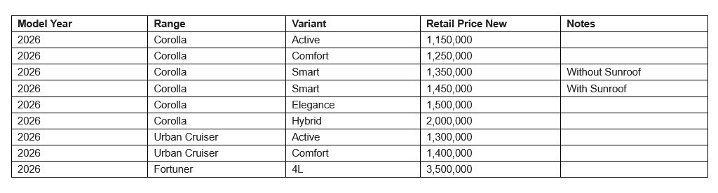 كشفت شركة تويوتا إيجيبت Toyota Egypt رسميًا عن أحدث قائمة أسعار طرازاتها في السوق المصري لطرازات عام 2026، والتي تضمنت طرح النسخ الجديدة من سيارات كورولا Corolla و أوربان كروزر Urban Cruiser و فورتشنر Fortuner.