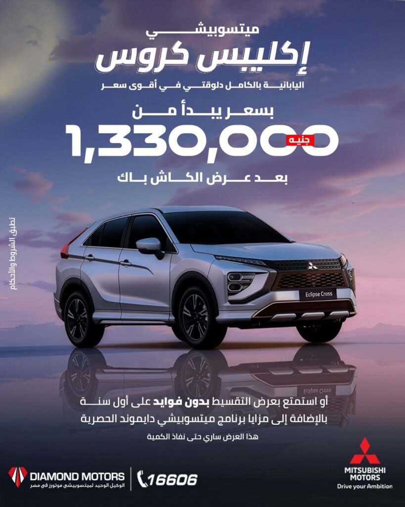 كشف وكيل ميتسوبيشي في مصر دايموند موتورز Diamond Motors عن طرح طراز ميتسوبيشي إكليبس كروس Mitsubishi Eclipse Cross موديل 2025 بسعر جديد يعد من أبرز التخفيضات التي يشهدها السوق خلال الفترة الحالية، مع إتاحة خيار الكاش باك أو الاستفادة من برنامج التقسيط بدون فوائد على أول سنة، إلى جانب مجموعة من المزايا الحصرية ضمن برنامج “ميتسوبيشي دايموند Mitsubishi Diamond“.