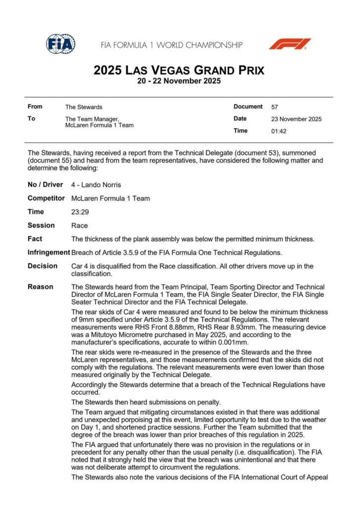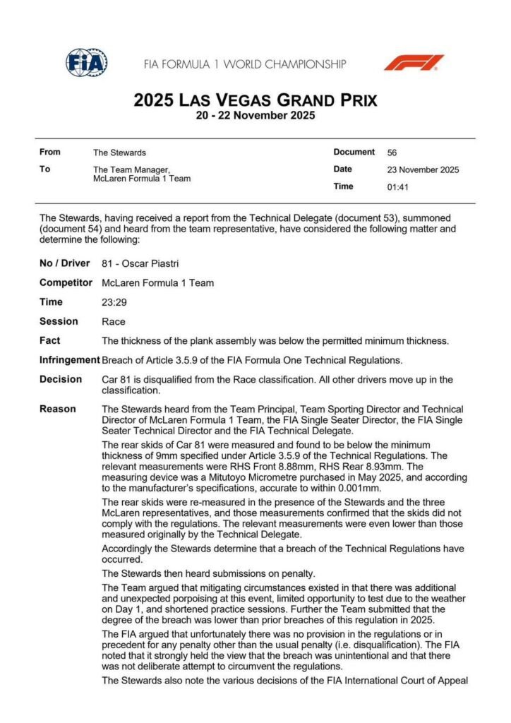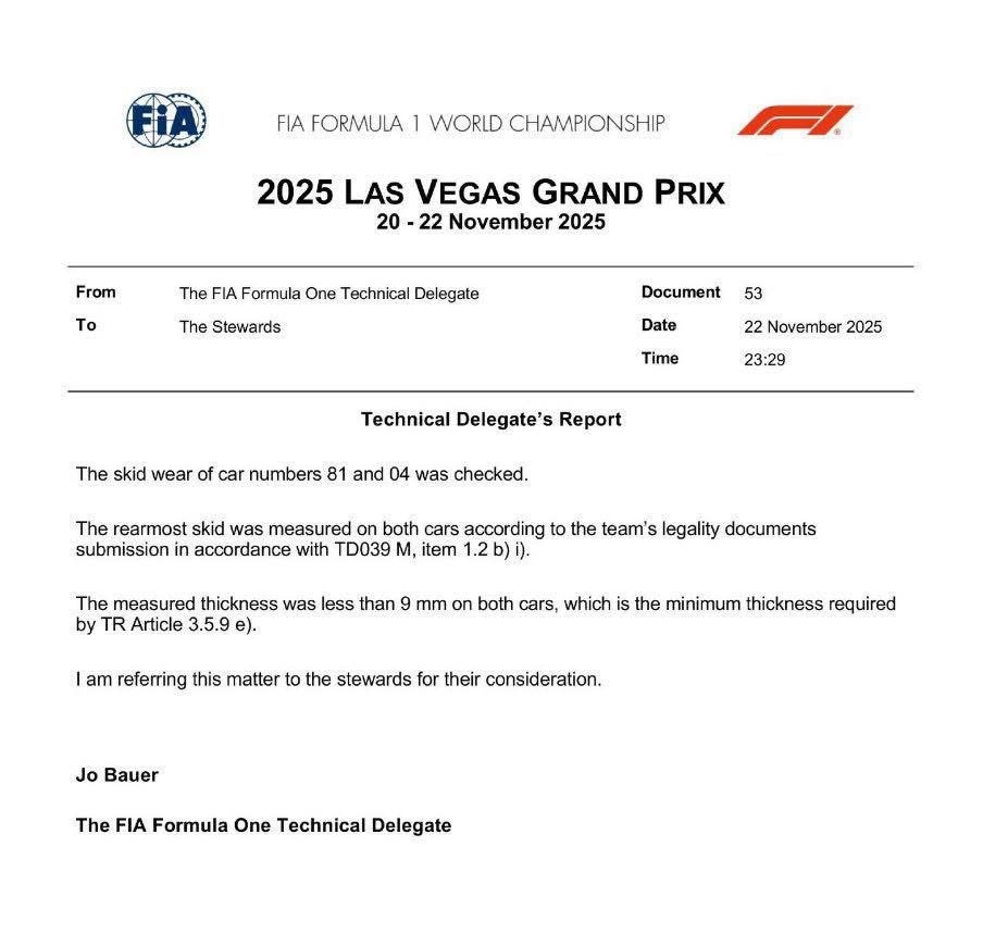 أصدرت الهيئة المنظمة لبطولة العالم لسباقات الـ فورمولا-1 –FIA قرارًا رسميًا باستبعاد سائقي فريق مكلارين McLaren Formula 1 Team، لاندو نوريس Lando Norris و أوسكار بياستري Oscar Piastri، من الترتيب النهائي لسباق جائزة لاس فيجاس الكبرى 2025، وذلك بعد ثبوت مخالفة تقنية تتعلق بسُمك ألواح الانزلاق السفلية Skid Plank في السيارتين، بما لا يتوافق مع اللوائح الفنية المعتمدة.