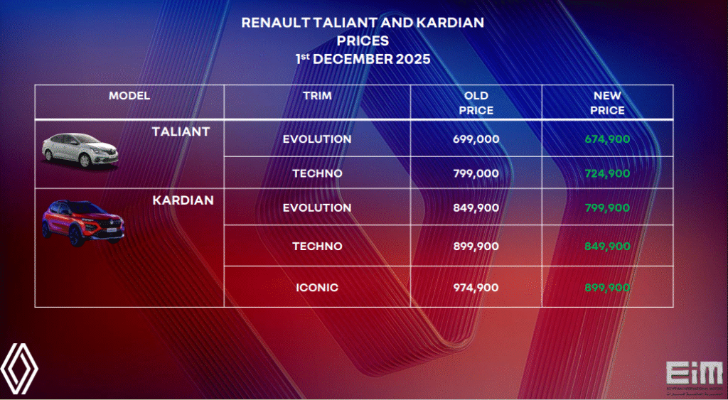 شهد السوق المصري للسيارات حركة ملحوظة مع إعلان الشركة المصرية العالمية للسيارات EIM، الوكيل الرسمي لعلامة رينو Renault في مصر، عن تطبيق تخفيضات جديدة على أسعار طرازَي رينو تالينت Renault Taliant و رينو كارديان Renault Kardian، وذلك اعتبارًا من الأول من ديسمبر 2025.