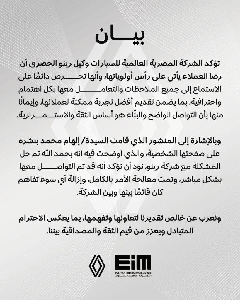 واختتمت الشركة بيانها بالتعبير عن خالص تقديرها لتعاون العملاء وتفهمهم، مؤكدة أن هذا التفاعل الإيجابي يعكس مستوى الاحترام المتبادل بين الشركة وعملائها، ويساهم في تعزيز قيم الثقة والمصداقية التي تحرص المصرية العالمية للسيارات EIM على ترسيخها باستمرار في جميع تعاملاتها، بما يدعم مكانة علامة رينو Renault ويعزز حضورها في السوق المحلي.