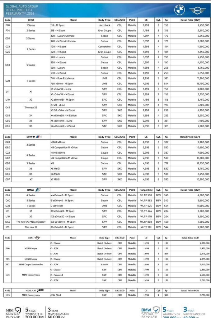 كشفت جلوبال أوتو Global Auto Group، الوكيل الرسمي لعلامتي بي إم دبليو BMW و ميني MINI في السوق المصري، عن أحدث قائمة أسعار سيارات BMW و MINI المعتمدة خلال شهر يناير 2026، مع تقديم فئات جديدة لأول مرة، وإجراء تعديلات سعرية على بعض الطرازات.