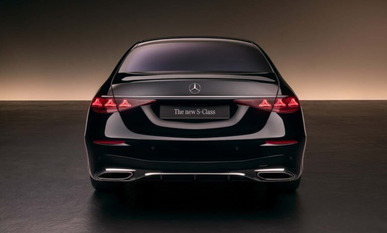 في الخلف، تستلهم S-Class الجديدة تصميمها من أحدث أجيال الفئة E، حيث تأتي المصابيح الخلفية الأفقية بتصميم يحتوي على ثلاث وحدات إضاءة على شكل نجمة داخل كل مصباح، مع شريط كرومي يمتد بعرض غطاء صندوق الأمتعة. كما تحيط لمسات من الكروم بمخارج العادم المزدوجة أسفل الصادم الخلفي.