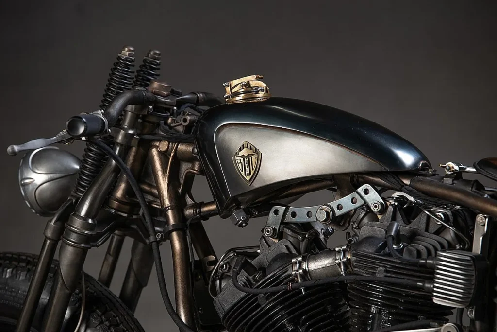 يتميز خزان الوقود بتصميم Scalloped مع لمسات نحاسية تضيف طابعًا معاصرًا دون الابتعاد عن الروح التاريخية، كما يبرز تصميم أسفل الخزان تفاصيل أغطية الصمامات الخاصة بمحرك Knucklehead بشكل واضح.