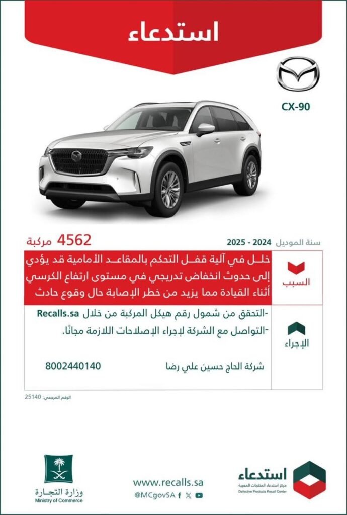 أعلنت وزارة التجارة في المملكة العربية السعودية عن إطلاق حملة استدعاء تشمل عددًا من سيارات مازدا CX-90 Mazda موديلات 2024 و2025، وذلك بالتنسيق مع الوكيل المحلي شركة الحاج حسين علي رضا، بعد رصد خلل تقني قد يؤثر على آلية قفل المقاعد الأمامية، بما قد ينعكس على مستوى السلامة أثناء القيادة.