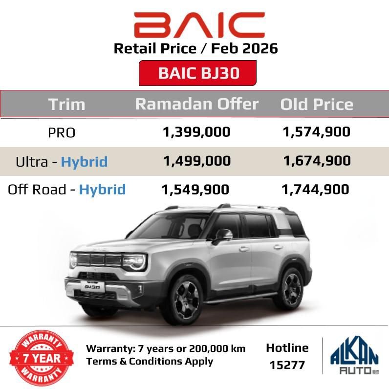 أعلنت مجموعة ألكان أوتو Alkan Auto، الوكيل المحلي لعلامة بايك BAIC في السوق المصري، عن إطلاق عرض استثنائي بمناسبة شهر رمضان المبارك على السيارة الرياضية متعددة الاستخدامات بايك BAIC BJ30، يتضمن تخفيضات مباشرة تصل إلى 195 ألف جنيه.