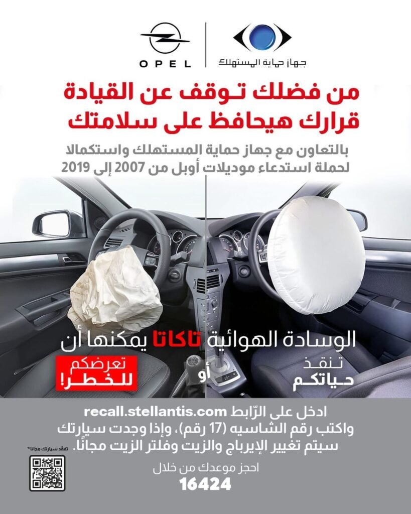 أعلنت أوبل Opel العالمية للسيارات، التابعة لمجموعة ستيلانتس Stellantis، عن إطلاق حملة استدعاء رسمية لعدد من سياراتها في السوق المصري بالتعاون مع جهاز حماية المستهلك، وذلك في إطار الإجراءات الاحترازية التي تتخذها الشركة لضمان أعلى مستويات السلامة والأمان لعملائها. وتأتي هذه الحملة ضمن برنامج عالمي لمعالجة مشكلة محتملة في الوسائد الهوائية التي تنتجها شركة Takata، والتي قد تتعرض للتلف مع مرور الوقت في بعض الظروف المناخية، وهو ما قد يؤثر على كفاءة عملها أثناء الحوادث.