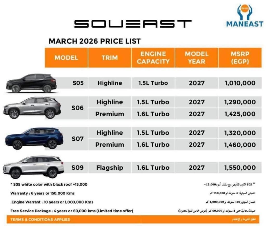 بدأت قائمة الأسعار الجديدة لطرازات سوإيست موديل 2027 بزيادة ملحوظة على طراز S05، حيث سجل سعره الجديد مليون و10 آلاف جنيه، مقارنة بسعره السابق البالغ 949 ألف جنيه، بفارق 61 ألف جنيه.