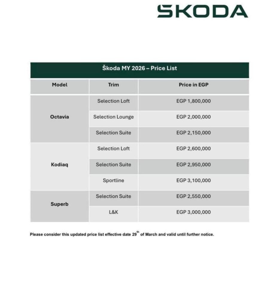 شهدت سيارات سكودا Škoda في السوق المصري تحديثًا جديدًا في قائمة الأسعار الرسمية الخاصة بموديلات 2026، وذلك وفقًا لأحدث قائمة سعرية تم اعتمادها اعتبارًا من 29 مارس، لتشمل الزيادات مختلف الطرازات المطروحة محليًا، وفي مقدمتها أوكتافيا Octavia وكودياك Kodiaq وسوبيرب Superb.