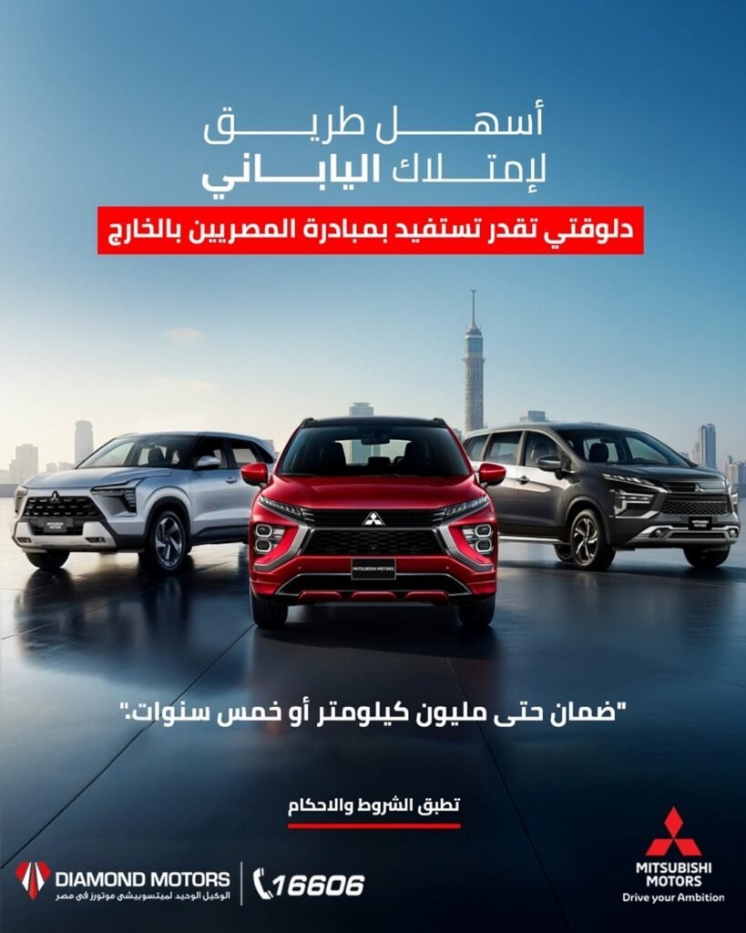 أعلنت شركة دايموند موتورز Diamond Motors، الوكيل الحصري لعلامة ميتسوبيشي موتورز Mitsubishi Motors في مصر والتابعة لمجموعة الملا الكويتية، عن إطلاق منظومة خدمات بيع متكاملة موجهة لعملاء “مبادرة استيراد سيارات المصريين المقيمين بالخارج”، وذلك في إطار التوسع في تقديم خدمات متخصصة تتماشى مع متطلبات هذه الشريحة من العملاء داخل السوق المصري.