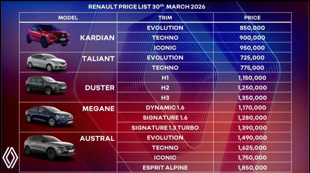 أما رينو تاليانت  Renault Taliant، فأصبحت تبدأ من 725 ألف جنيه للفئة Evolution، وترتفع إلى 775 ألف جنيه للفئة Techno.