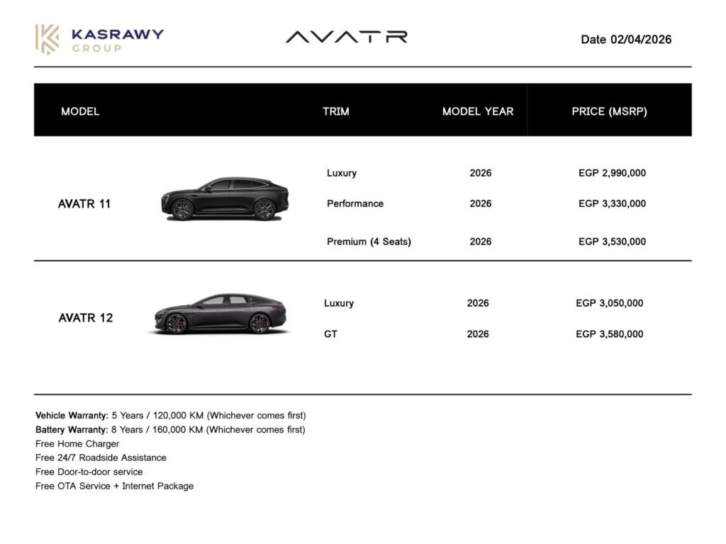 إلى جانب القائمة السعرية الجديدة، تستمر قصراوي جروب Kasrawy Group في تقديم مجموعة من خدمات الضمان الرسمية على سيارات أفاتار Avatr.
