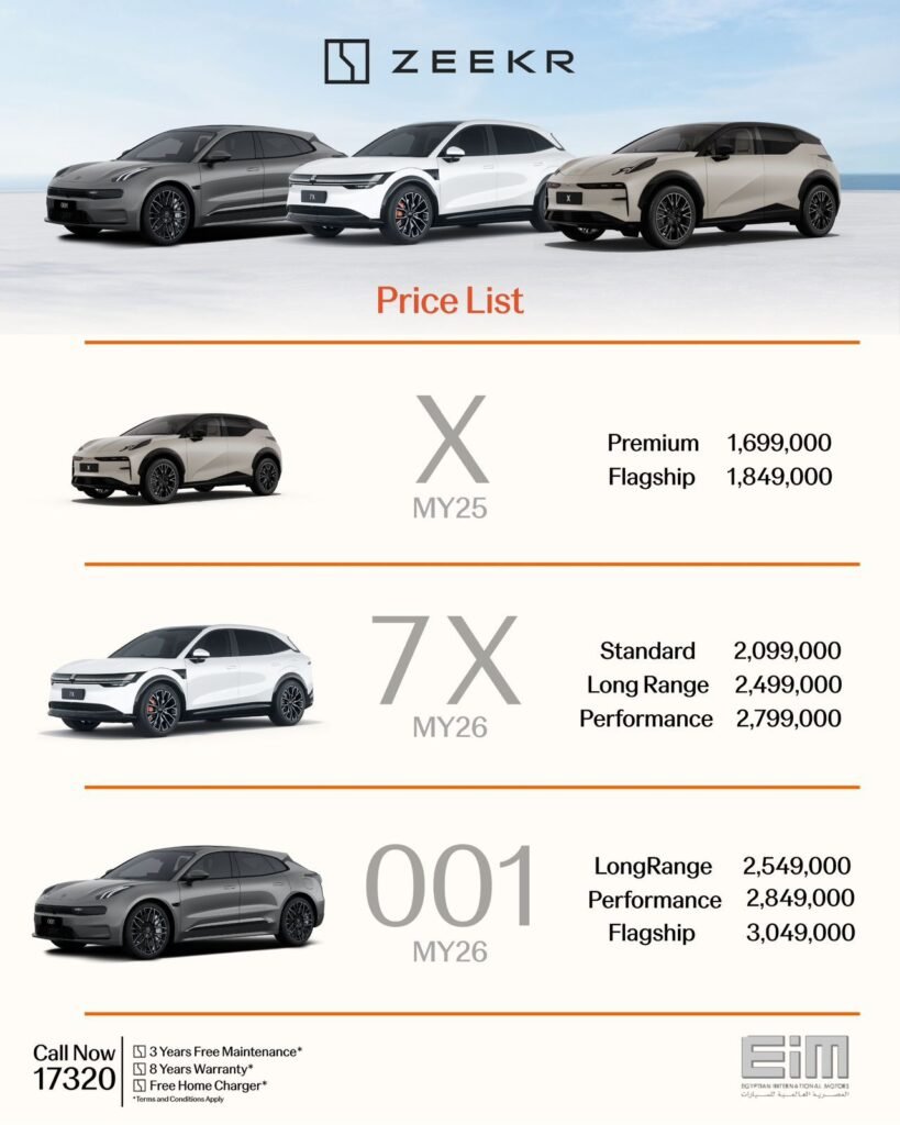 شهدت سيارات زيكر ZEEKR في السوق المصري موجة جديدة من الزيادات السعرية، وفق أحدث قائمة أسعار صادرة عن المصرية العالمية للسيارات EIM – Egyptian International Motors، الوكيل المحلي للعلامة، لتشمل طرازات زيكرZEEKR X وزيكر ZEEKR 7X وزيكر ZEEKR 001، مع استمرار تقديم عدد من المزايا المصاحبة تشمل الصيانة المجانية والضمان والشاحن المنزلي.
