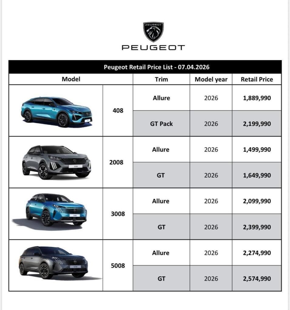 شملت الزيادة أيضًا بيجو  Peugeot 2008 موديل 2026، حيث بلغ سعر فئة Allure مليون و499 ألفًا و990 جنيهًا. فيما سجلت الفئة GT سعرًا جديدًا وصل إلى مليون و649 ألفًا و990 جنيهًا.