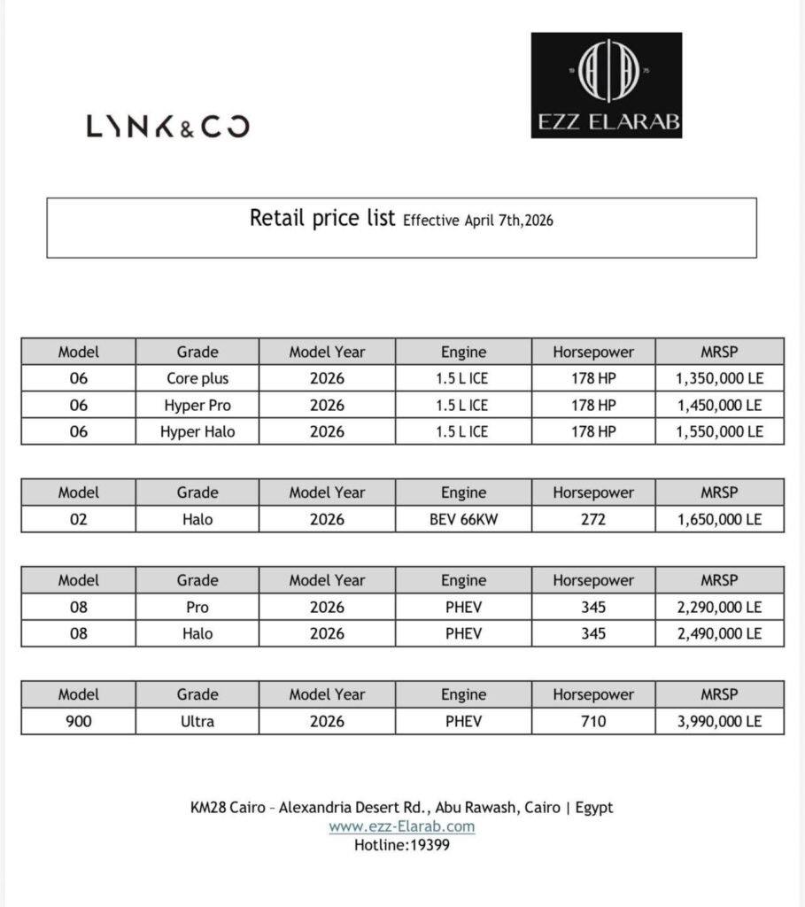 أعلنت عز العرب Ezz Elarab، الوكيل المحلي لعلامة لينك آند كو Lynk & Co في السوق المصري، عن أحدث قائمة سعرية رسمية لسيارات العلامة، على أن يبدأ العمل بها اعتبارًا من 7 أبريل 2026، في خطوة تعكس موجة الزيادات السعرية المستمرة التي يشهدها قطاع السيارات في مصر خلال الفترة الحالية.