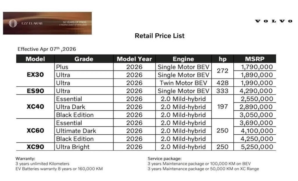 شهدت أسعار سيارات فولفو Volvo في السوق المصري زيادة جديدة وفق أحدث قائمة سعرية رسمية صادرة عن عز العرب Ezz Elarab، الوكيل المحلي للعلامة السويدية، على أن يبدأ تطبيق الأسعار الجديدة اعتبارًا من 7 أبريل 2026. وشملت الزيادة عددًا من الطرازات الكهربائية والهجينة الخفيفة ضمن موديلات 2026، لتطال مجموعة واسعة من السيارات التي تبدأ من فولفو Volvo EX30 وصولًا إلى فولفو Volvo XC90.